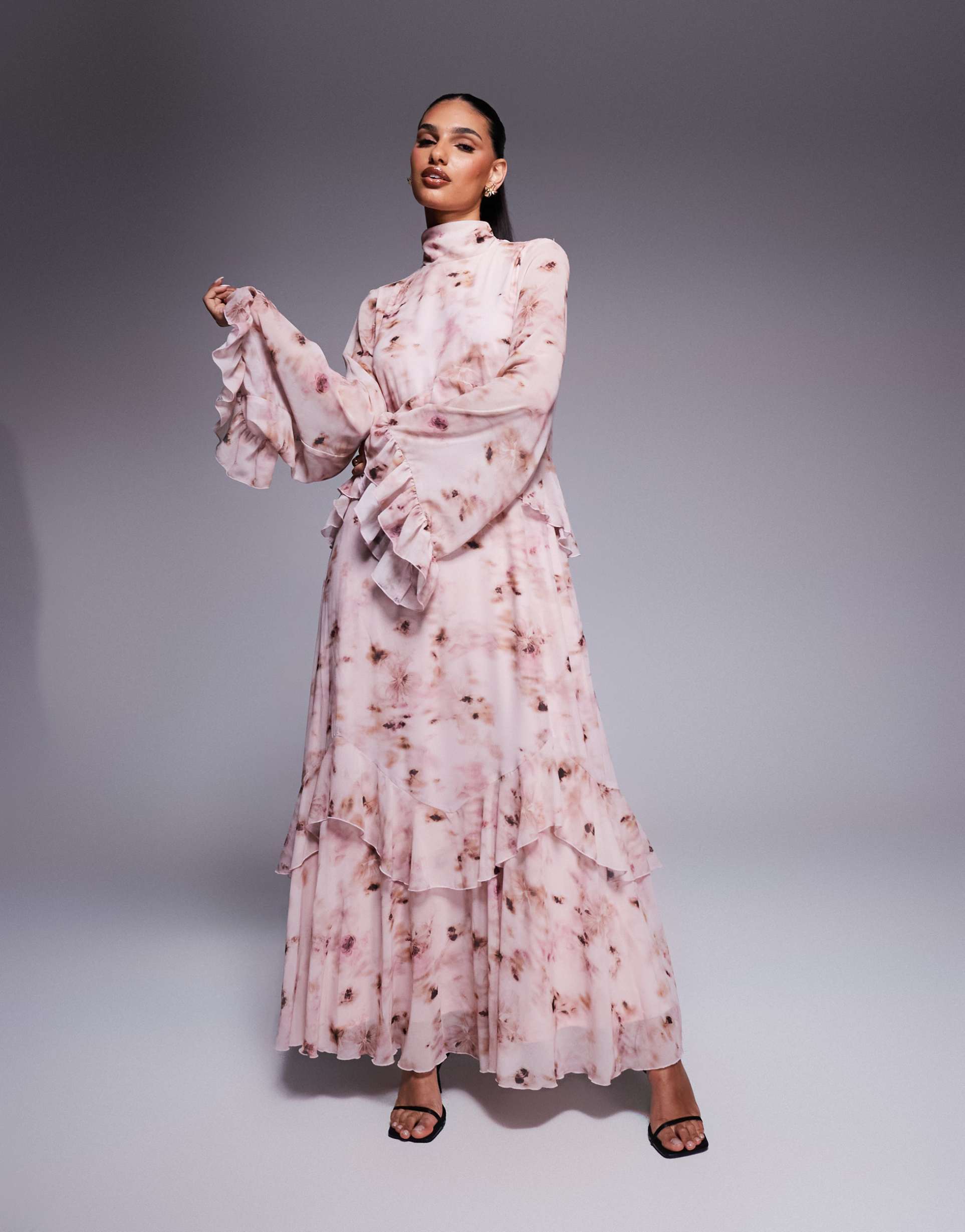 DASKA LAYERED RUFFLE HIGH NECK MAXI DRESS IN PINK FLORAL PRINT