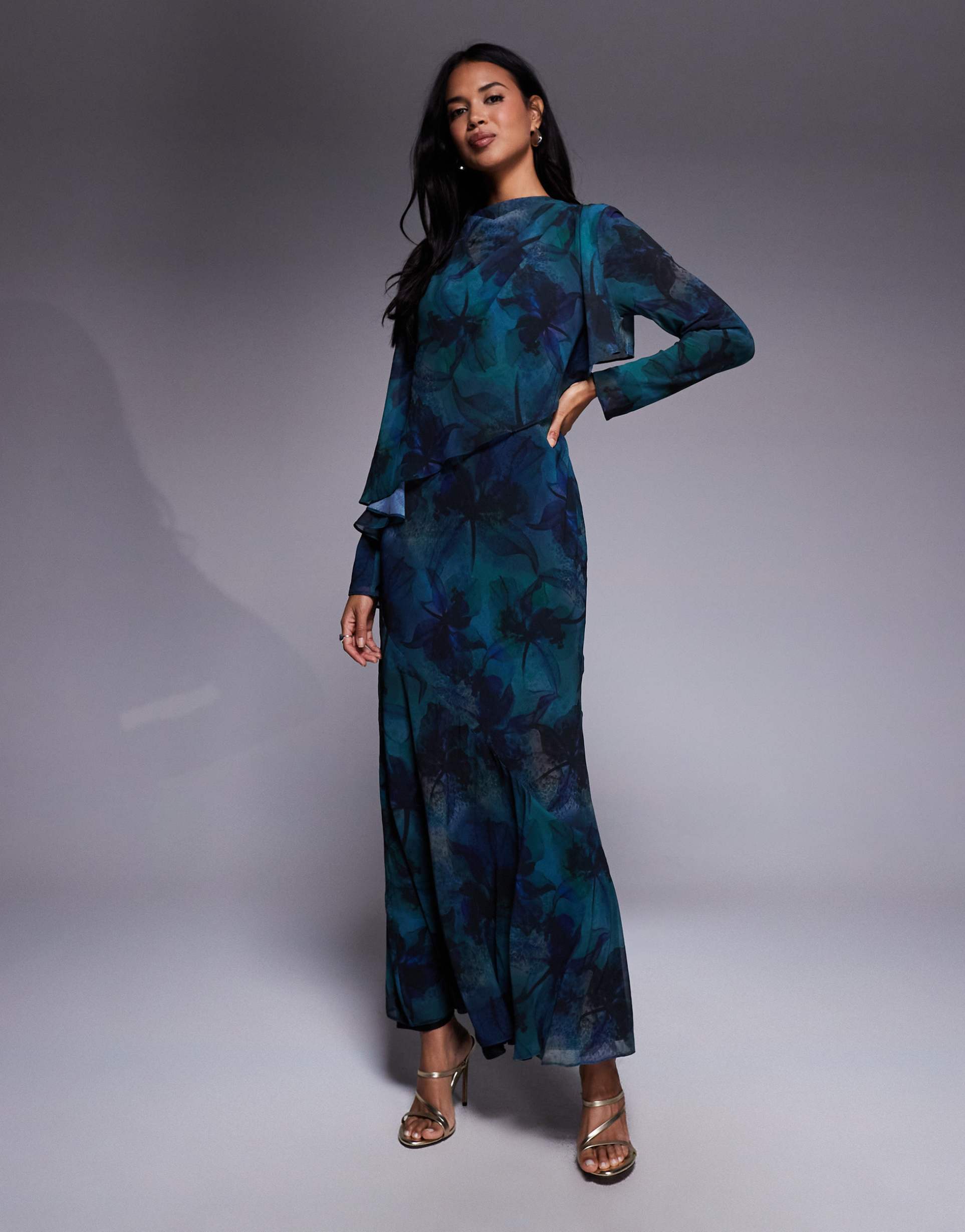 DASKA RUFFLE CAPE MAXI DRESS IN DEEP BLUE ABSTRACT PRINT