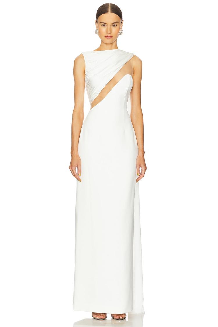 A sleek white column gown featuring an asymmetric neckline and sleeveless cut that beautifully sculpts the silhouette. Crafted from a luxurious crepe fabric with a ruched jersey overlay and a sheer mesh panel at the bodice, this maxi-length dress offers elegant draping details on the front and a sophisticated back vent for ease of movement. The concealed side zipper closure ensures a smooth fit, making it perfect for formal events, cocktail parties, or red carpet appearances. Its modern, refined style embodies timeless sophistication with a subtle edge.