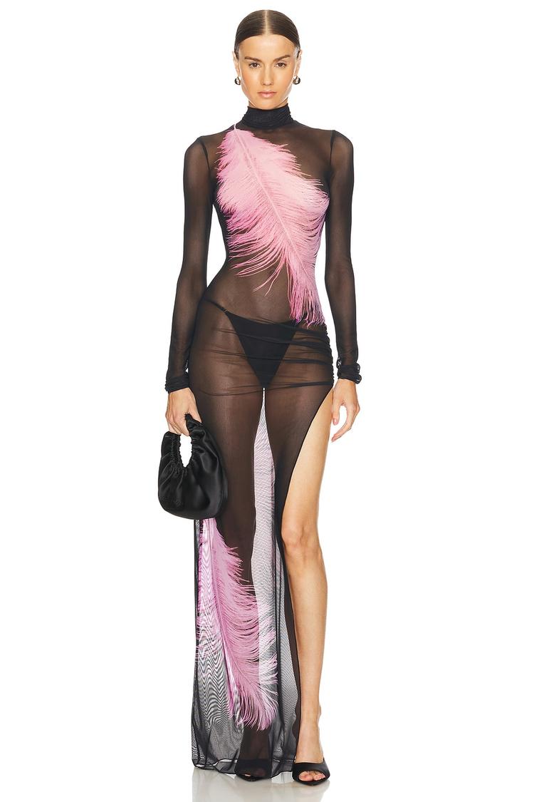 Sheer mesh panels and a figure-hugging column silhouette define this maxi gown, accentuated by a high neckline and long sleeves. The design features a striking dusty rose feather print that contrasts vividly against the matte black base, creating an elegant yet daring look. A front slit adds a sultry touch while the bodycon fit sculpts the silhouette perfectly. Crafted from a polyamide-elastane blend, this gown offers a sleek stretch texture ideal for cocktail parties, night outs, and formal events, making it a standout piece for confident, modern style lovers.