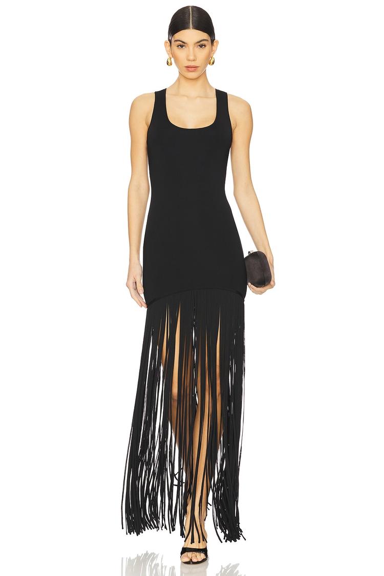 A sleek matte black sheath silhouette features a fitted bodice with a U-neck and wide straps, flowing into a dramatic maxi-length fringed hem that adds movement and edge. Crafted from a heavyweight jersey blend of viscose, nylon, and elastane, this dress offers comfortable stretch and structure. The concealed back zipper ensures a smooth fit, making it ideal for cocktail parties, night outs, or date nights. Its modern and elegant design merges classic sophistication with contemporary flair, perfect for standing out with subtle statement detailing.