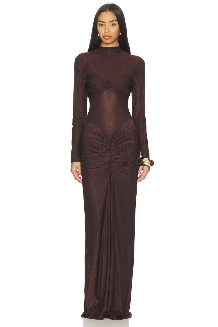 Heavyweight metallic jersey fabric shapes this elegant column maxi dress, featuring a high neckline and long regular sleeves for a sleek silhouette. The fitted design is enhanced by front and back ruched detailing and a back vent for ease of movement. Ideal for autumn and winter evenings, this sophisticated dress suits cocktail parties, formal events, and night outs with its hidden back zip closure and graceful floor-length hemline.