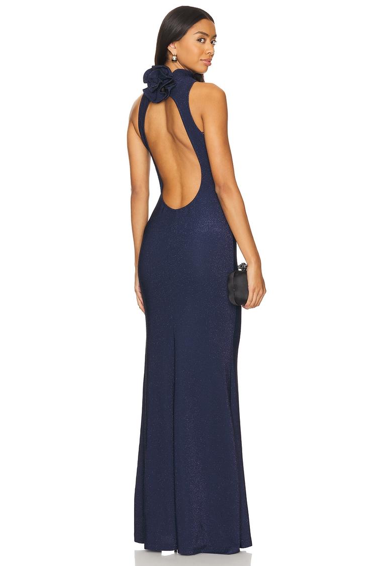 A sleek column silhouette meets a high neckline and sleeveless design in this matte dark blue maxi dress crafted from lightweight jersey with metallic threading for subtle shimmer. The open back features a delicate 3D florette applique, adding elegant detail to the minimalist style. Its slim fit and pull-on construction create a sophisticated look perfect for cocktail parties, formal events, or date nights. The clean hemline and jersey fabric ensure comfort and ease, making this versatile piece a refined choice for evening occasions and semi formal gatherings.
