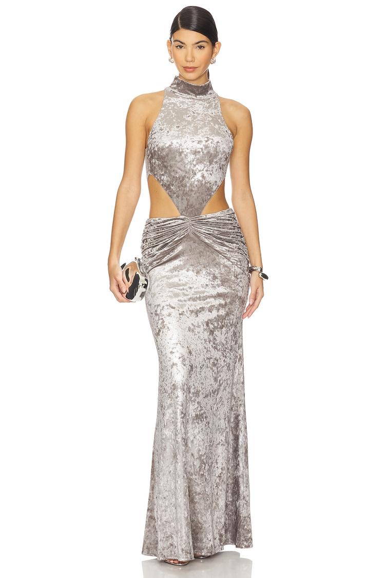 Metallic silver fabric with a subtle shimmer defines this column silhouette maxi dress, featuring a sleek high neckline and sleeveless style for a modern edge. The fitted bodice flows into a ruched midsection with elegant cut-out sides, creating a sexy yet sophisticated profile. Concealed back zipper closure ensures a seamless look, while the fully lined polyester-spandex-nylon blend provides comfort and stretch. Ideal for cocktail parties, formal events, and night outs, this dress balances glamour with contemporary style effortlessly.