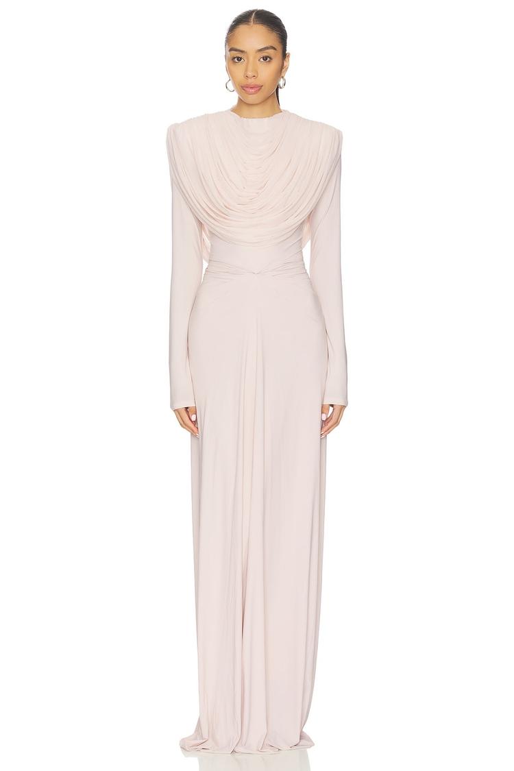 Soft matte off-white fabric with a blend of nylon and lycra sculpts a fitted column silhouette that flows gracefully to the floor. The Alma Dress features elegant long sleeves and a classic round neckline, enhanced by structured padded shoulders and sweeping draped detail across the bodice for sophisticated dimension. Designed for all-weather wear, this maxi-length gown offers pull-on ease and a fully lined finish, making it a refined choice for cocktail, semi-formal, and formal events where understated elegance is key.