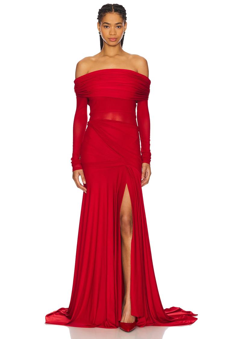 A striking matte red column gown featuring a fitted silhouette and a dramatic side slit that adds allure to its long maxi hem. The off-shoulder foldover neckline and long sleeves crafted from lightweight mesh and stretch jersey fabric create an elegant and sophisticated look. Designed for formal occasions such as galas, cocktail events, and red carpet appearances, this gown offers both style and comfort with its pull-on elastic neckline and sleek, clean hemline. Perfect for making a statement at upscale evening events.