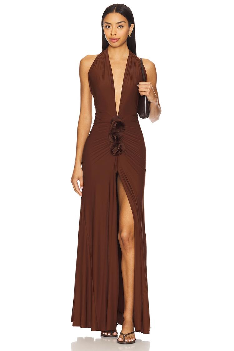 Softly draping midweight jersey fabric sculpts a sleek column silhouette in this maxi-length dress. The plunging V-neckline and sleeveless halter style with hook and eye closure create an alluring look, while the 3D floral applique at the front adds a unique touch of texture. A daring front slit enhances movement and sexiness, perfect for date nights, cocktail parties, or a chic night out. Crafted from a nylon-lycra blend, this dress offers a comfortable slim fit that contours the body elegantly across all seasons.