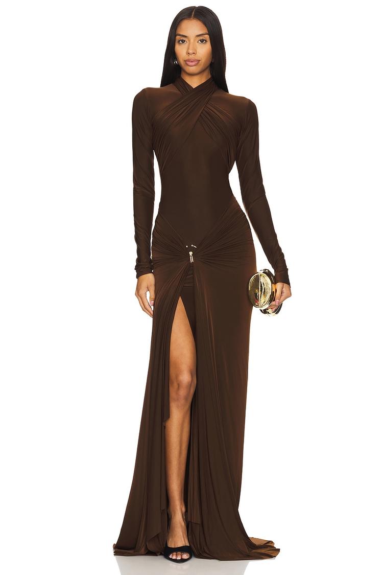 A matte brown jersey sheath gown with long sleeves and a distinctive halter neckline, this figure-hugging maxi features elegant draping at the waist accented by gold-tone hardware. The front slit adds a touch of allure, making it a sophisticated choice for cocktail parties, formal evenings, or glamorous night outs. Crafted from a comfortable polyester and elastane blend, it promises both stretch and style in any season.