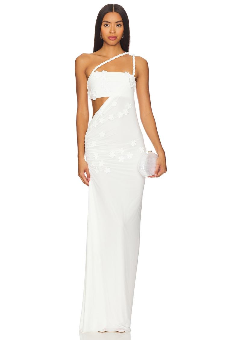 Soft white jersey fabric with a hint of stretch sculpts this elegant column gown, enhanced by delicate 3D floral appliques that cascade all over. The asymmetric neckline and criss-cross back straps add a modern and sexy touch, while the fitted silhouette flows gracefully to the clean maxi hem. Ideal for spring and summer cocktail parties, formal events, or a glamorous night out, this gown combines sophisticated design with comfortable pullover styling and an elastic waistband for ease of wear.