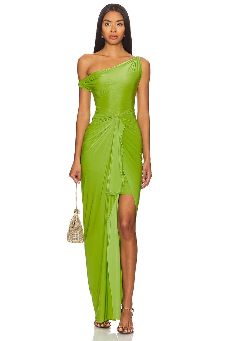 Vibrant bright green slinky jersey fabric sculpts a sleek column silhouette with a striking asymmetric neckline and sleeveless, one-shoulder styling. The maxi length features a dramatic front slit complemented by elegant draping and ruffles, enhancing the bodycon fit. Crafted from stretchy polyester-spandex blend, this dress offers comfort and style for spring and summer evenings. Ideal for cocktail parties, date nights, and lively night outs, it combines modern trendiness with sexy sophistication for a standout look.