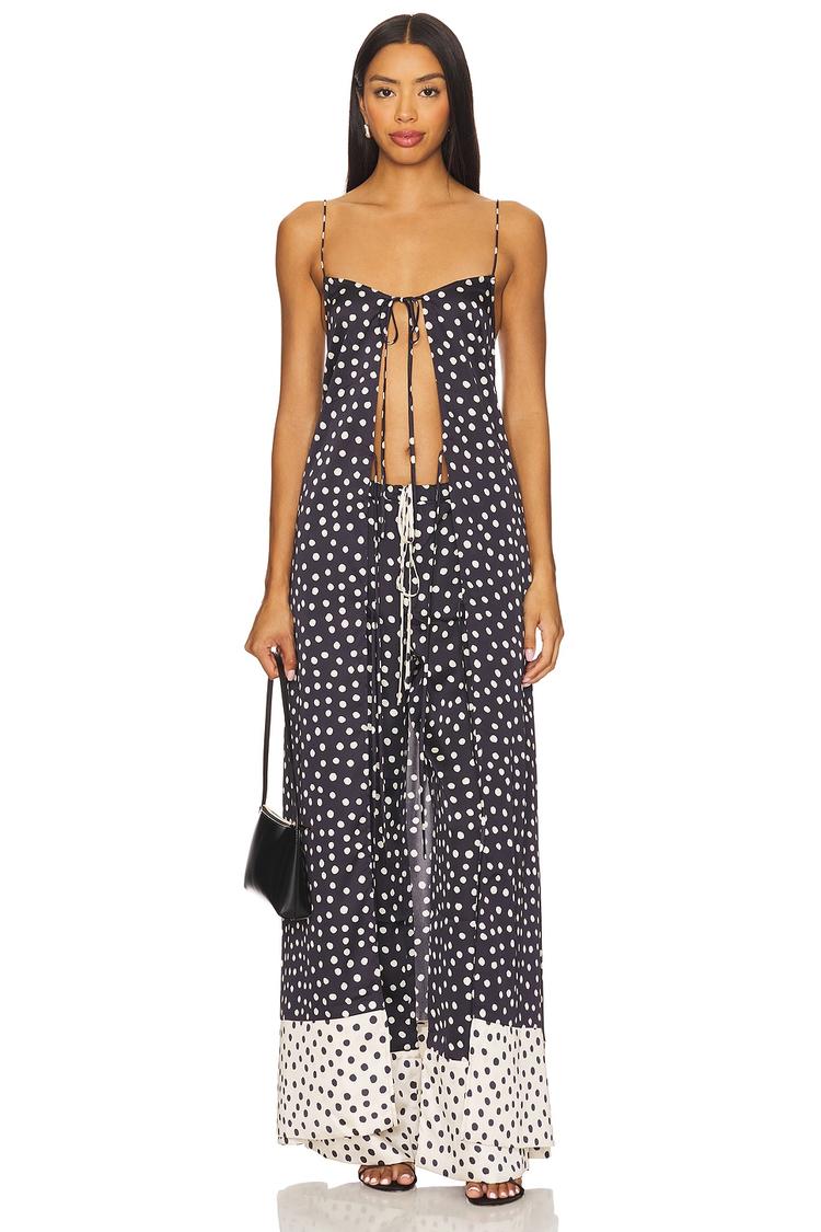 Polka dot satin in a relaxed maxi silhouette with a straight neckline and delicate spaghetti straps defines this breezy shift dress. Featuring an open front with tie-up closures, it offers a casual chic vibe perfect for beach days, poolside lounging, or summer brunches. The white polka dot print on a dark blue base is complemented by a contrasting hem, emphasizing its playful yet minimalist design. Crafted from lightweight polyester, this cover-up dress is ideal for vacation or warm-weather casual wear.