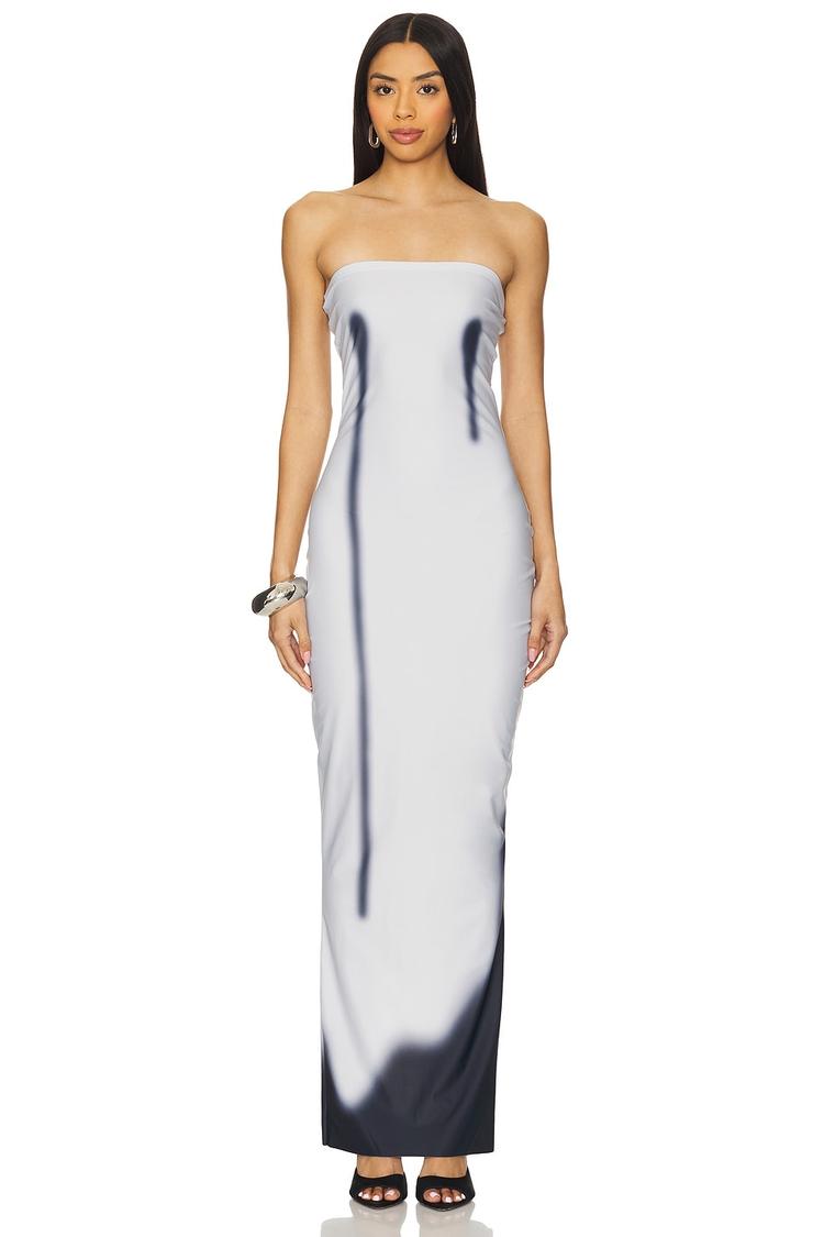 A sleek silhouette defines this strapless column dress featuring a striking abstract black drip pattern across a matte white base. Crafted from midweight jersey fabric with polyester and elastane, it offers a fitted shape that flatters the figure while ensuring comfort. The maxi length extends elegantly to the floor with a subtle back vent slit for ease of movement. Perfect for date nights, cocktail events, or nights out, this minimalist modern piece is designed for sophisticated, sexy style with effortless pull-on convenience.