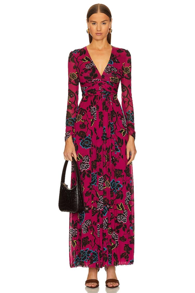 Shimmering dark pink mesh fabric with a graceful floral print covers this fitted wrap dress that flows to a maxi length. The long sleeves and V-neckline enhance its elegant silhouette, while draped fabric overlay adds sophisticated texture throughout. Ideal for date nights, cocktail parties, or a stylish night out, this lightweight polyester blend dress offers a chic and comfortable fit that transitions seamlessly across seasons. The clean hemline and covered back complete the refined look.