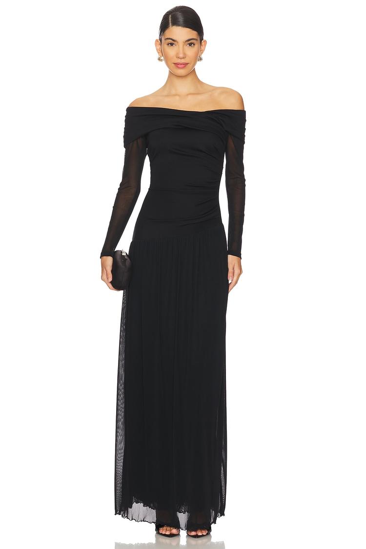 Soft chiffon sleeves and a flowing maxi skirt combine with a fitted jersey bodice to create an elegant off-shoulder column silhouette. The concealed back zipper and fully lined construction ensure comfort and sophistication. This matte black dress with sheer long sleeves offers a timeless look perfect for cocktail parties, formal events, and wedding guest occasions. The combination of viscose, nylon, spandex, and chiffon fabrics provides a flattering fit with a graceful drape that moves beautifully for any evening affair.