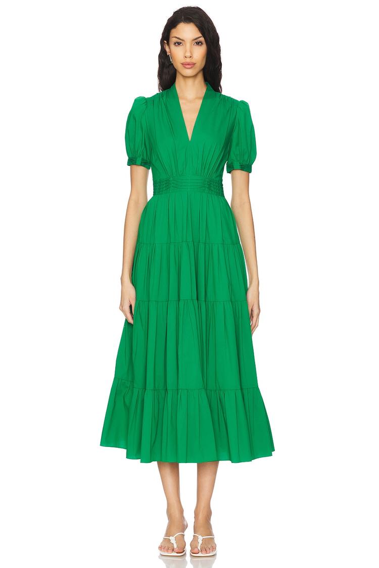Bright green poplin fabric shapes this classic shirt dress featuring a flattering V-neckline and half sleeves with loop button cuff details. The fitted bodice flows into a tiered midi-length hem, creating a timeless silhouette perfect for spring and summer. The concealed side zipper adds a sleek finish, while the breathable cotton poplin ensures comfort throughout the day. Ideal for casual outings, brunches, or business casual settings, this versatile dress offers effortless elegance and polished style.