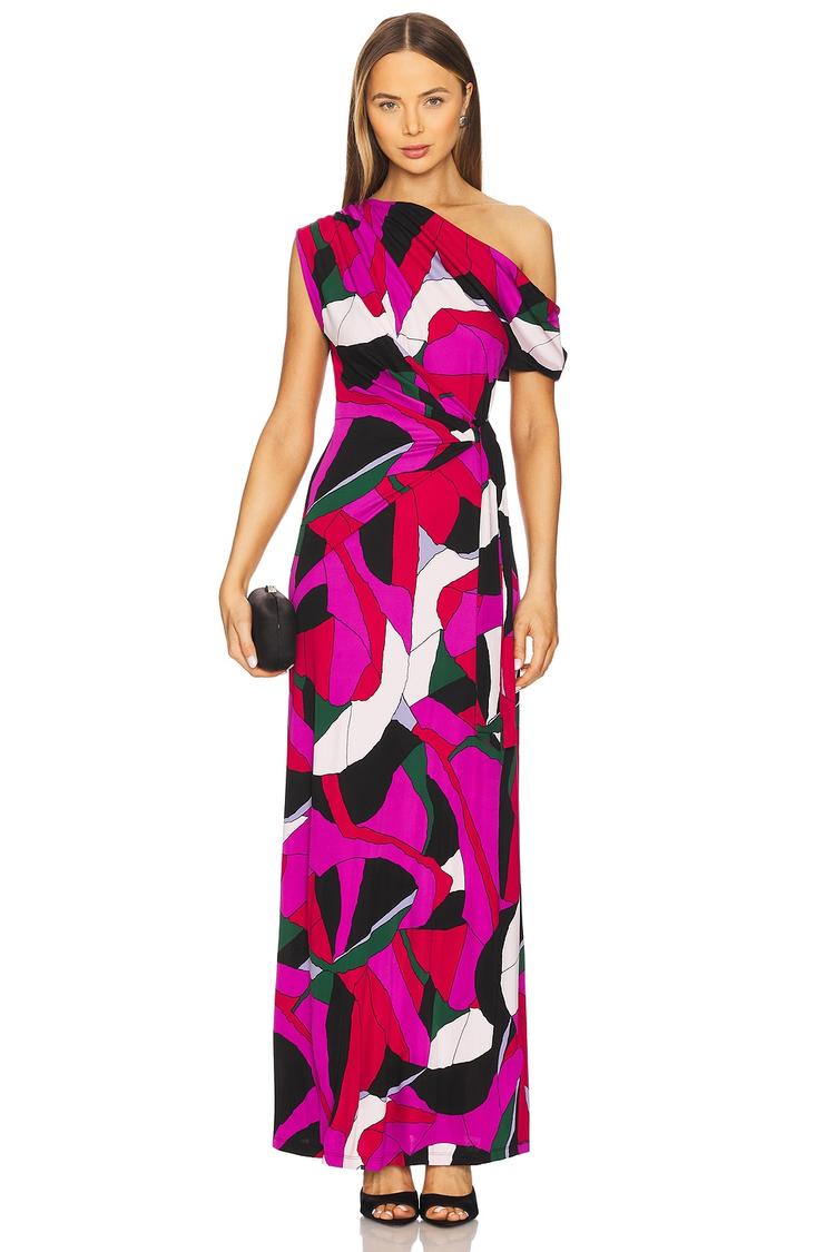 Bold and modern, this maxi wrap dress features an asymmetric one-shoulder neckline and a flowing silhouette in a vibrant abstract print of fuchsia, black, white, and green. Crafted from midweight viscose jersey, it offers a fitted yet comfortable pull-on fit with a back tie closure for added shape. The clean hemline complements its elegant style, making it a versatile choice for cocktail parties, date nights, and spring or summer brunches. Its chic design and breathable fabric blend create an effortlessly sophisticated look that stands out with ease.