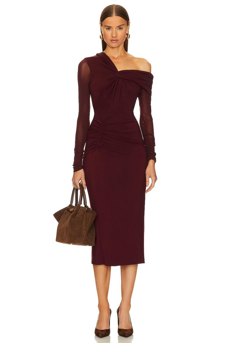 Rich burgundy midi dress crafted from a ruched midweight jersey fabric blends viscose, nylon, and spandex for a comfortable fitted silhouette. The off-shoulder neckline and semi-sheer long sleeves add an elegant and modern touch, while the hidden back zipper ensures a sleek, covered back. Perfect for autumn and winter evenings, this sheath dress is ideal for cocktail parties, date nights, and semi-formal events, delivering sophistication with every wear.