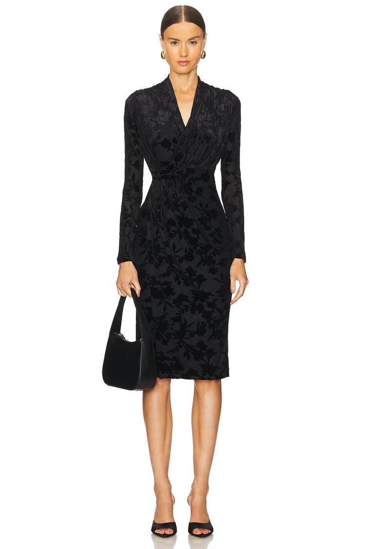 A timeless silhouette in plush velvet, this fitted sheath dress features a surplice neckline and long sleeves, perfect for cooler seasons. The tonal floral pattern adds subtle texture all over the matte black fabric, while the concealed back zipper keeps the design sleek and refined. Knee-length and fully lined, it offers an elegant yet comfortable fit ideal for workwear, business casual events, or date nights. Sophisticated and classic, this dress embodies understated luxury with versatile appeal for autumn and winter occasions.