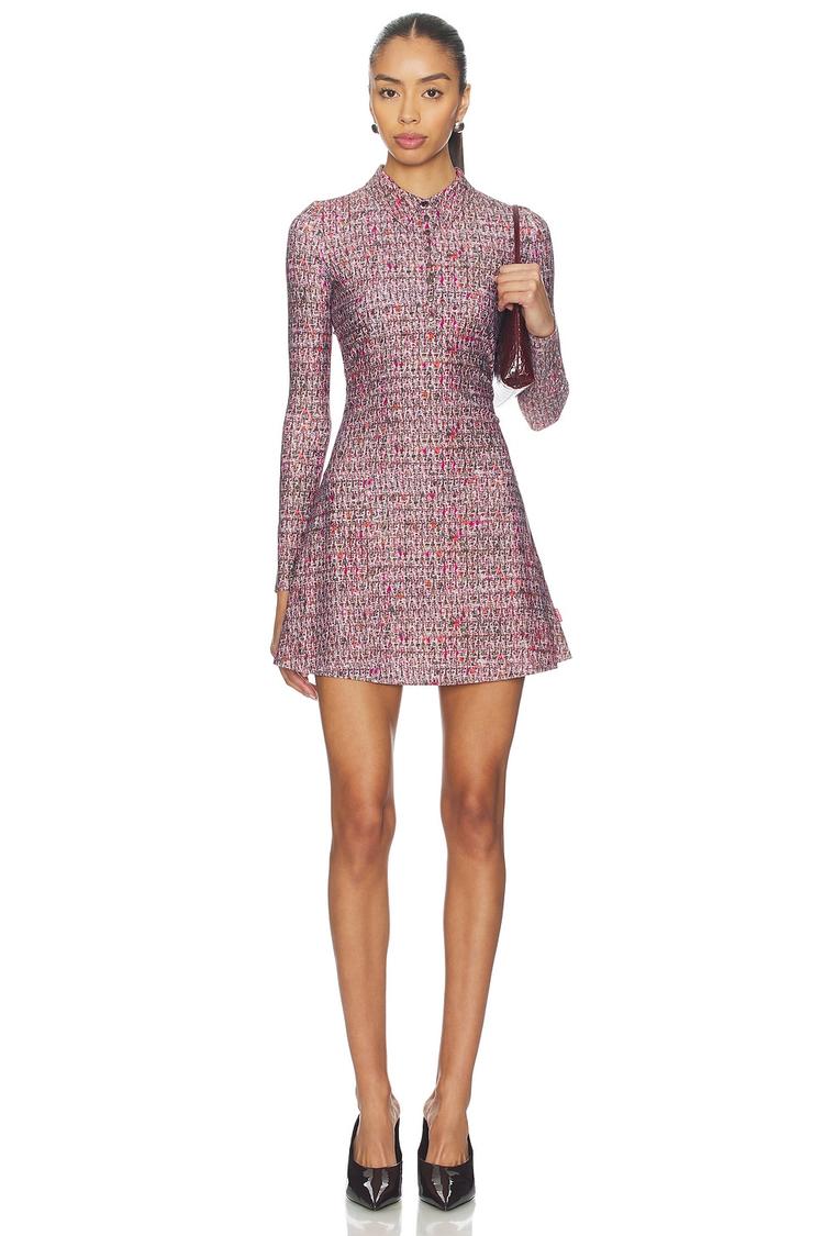 A sleek, fitted silhouette with a mini length and high neckline defines this Polyna Dress, crafted from midweight printed nylon-elastane jersey. The abstract all-over pattern in dusty pink and matte black creates a modern, trendy vibe, while long sleeves and a partial zip-button closure add subtle functionality. Perfect for casual outings, date nights, or a stylish night out, this dress balances comfort with chic appeal, making it a versatile addition to your wardrobe throughout the year.