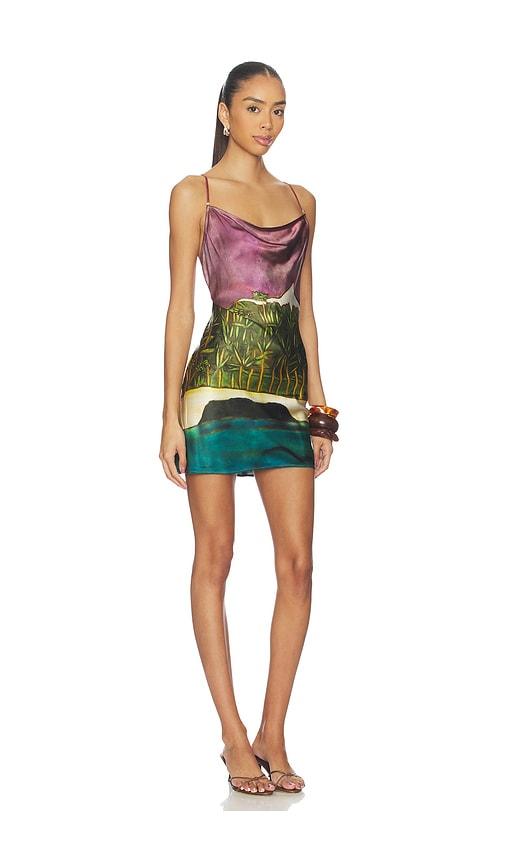 DONDE ESTEBAN LA SIERRA SILK MINI DRESS IN PURPLE,GREEN.