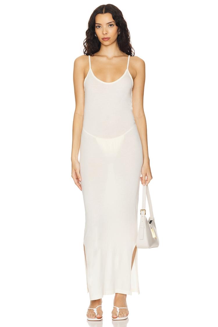 Soft cotton fabric and a slim, figure-hugging silhouette define this minimalist slip dress. Featuring a maxi length with a subtle side slit, it offers effortless elegance for spring and summer occasions. The sleeveless design with spaghetti straps and a U-neckline complements warm weather style, making it perfect for casual outings, brunch dates, or relaxed evening affairs. Its semi-sheer texture adds a delicate touch while maintaining comfort with pull-on styling. A versatile piece crafted in the USA, this dress blends simplicity with modern chic for everyday wear.
