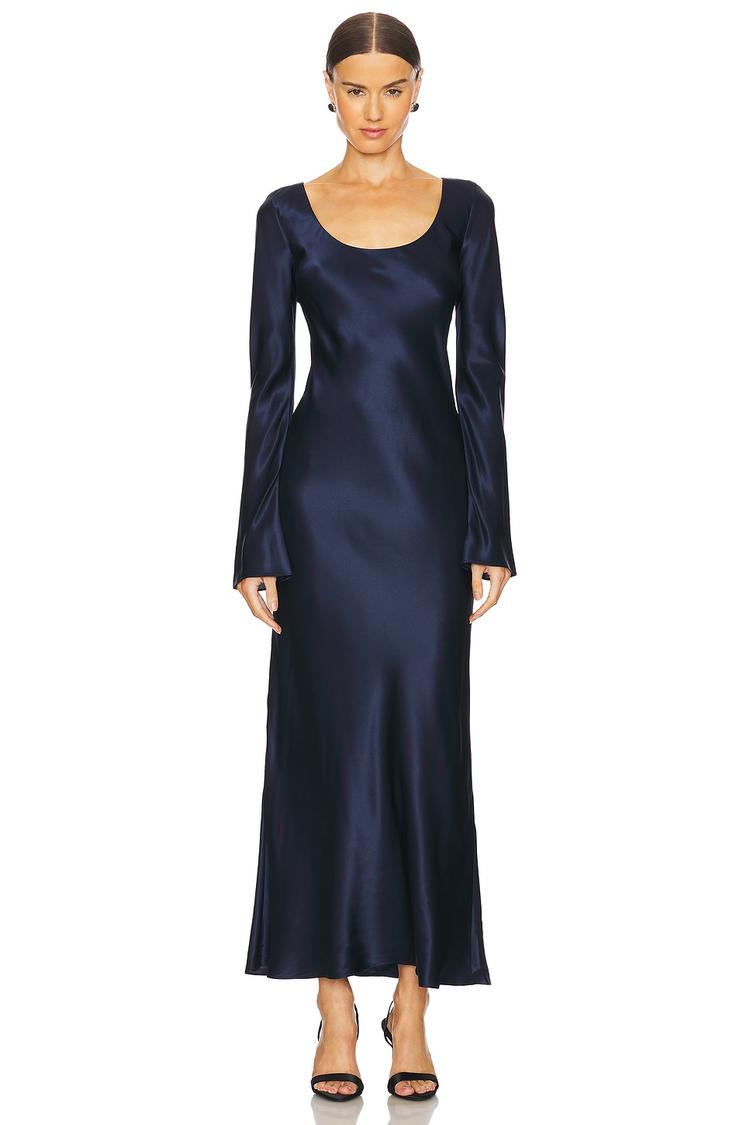 The Gilad Silk Maxi Dress showcases a sleek column silhouette in a deep matte dark blue charmeuse silk fabric that drapes elegantly. Featuring a deep scoop neckline and long regular sleeves, this slim-fit maxi offers a clean hemline and effortless slip-on styling. Its minimalist and sophisticated design makes it ideal for formal events, night outs, or romantic date nights. Lightweight and unlined, this versatile dress embraces timeless elegance and refined simplicity for all-weather wear.