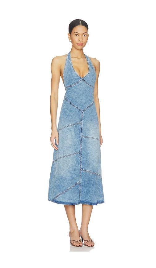 EB DENIM DELPHI PIECED HALTER DRESS IN BLUE.