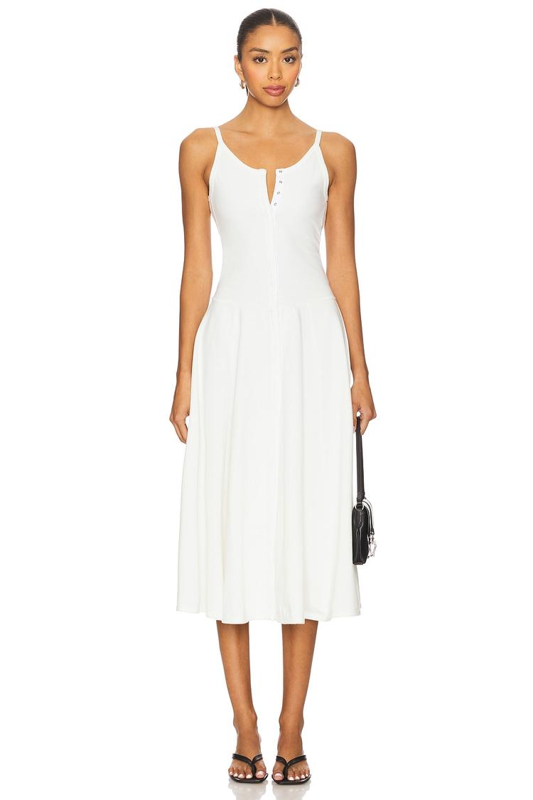 Soft, midweight cotton jersey forms a classic fit and flare silhouette in this elegant midi dress. Featuring a sleeveless design with wide straps and a round neckline, the dress offers a flattering fitted bodice and a clean hemline that falls gracefully below the knee. The front snap button closure adds subtle detail and easy wearability. Ideal for casual outings, brunches, or relaxed date nights, this versatile white dress blends timeless charm with comfortable fabric perfect for spring and summer seasons.