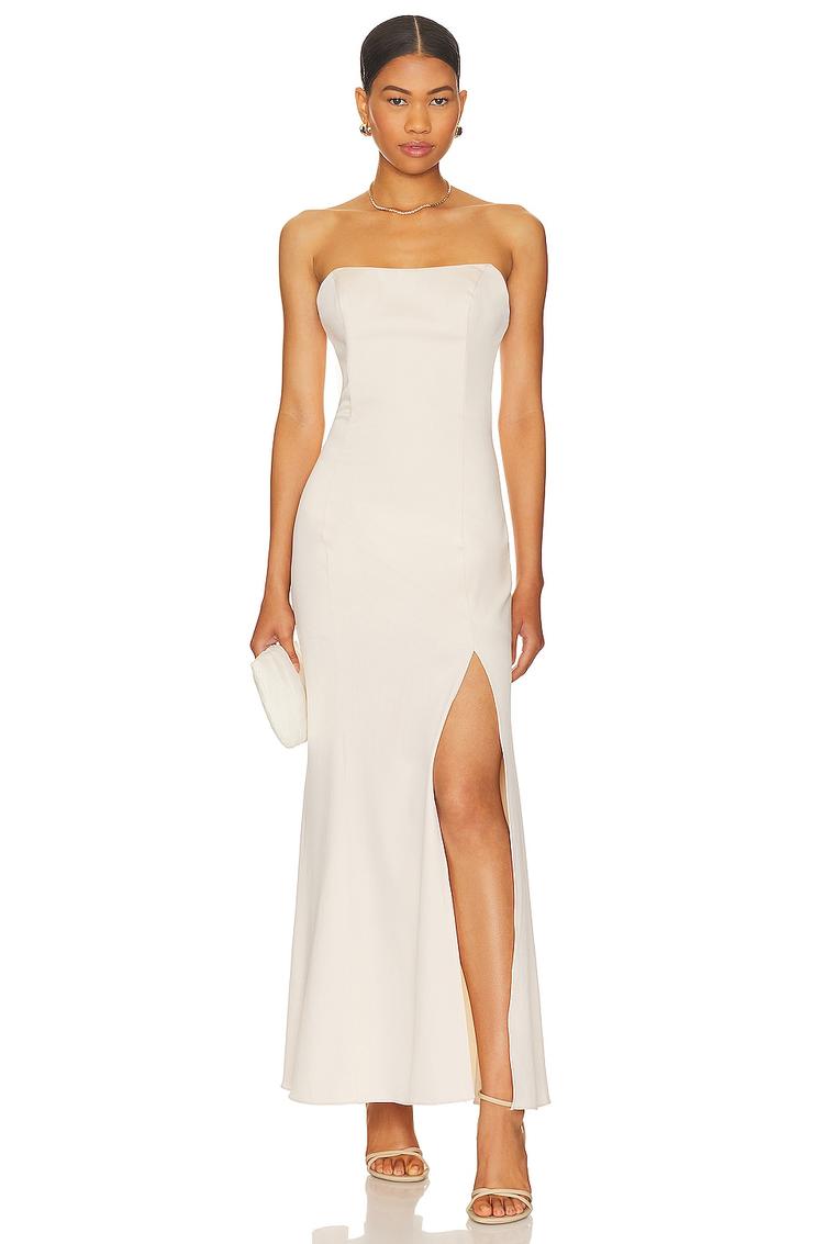 A sleek column silhouette crafted in midweight crepe de chine polyester blend highlights the elegant simplicity of this strapless gown. Featuring a straight neckline and a flattering fitted cut, this maxi-length dress is enhanced by boned sides for structured support and a sophisticated side slit for movement. The concealed back zipper closure ensures a smooth finish. Ideal for formal occasions, cocktail parties, or wedding guest attire, this minimalist gown exudes timeless grace and versatility across seasons.