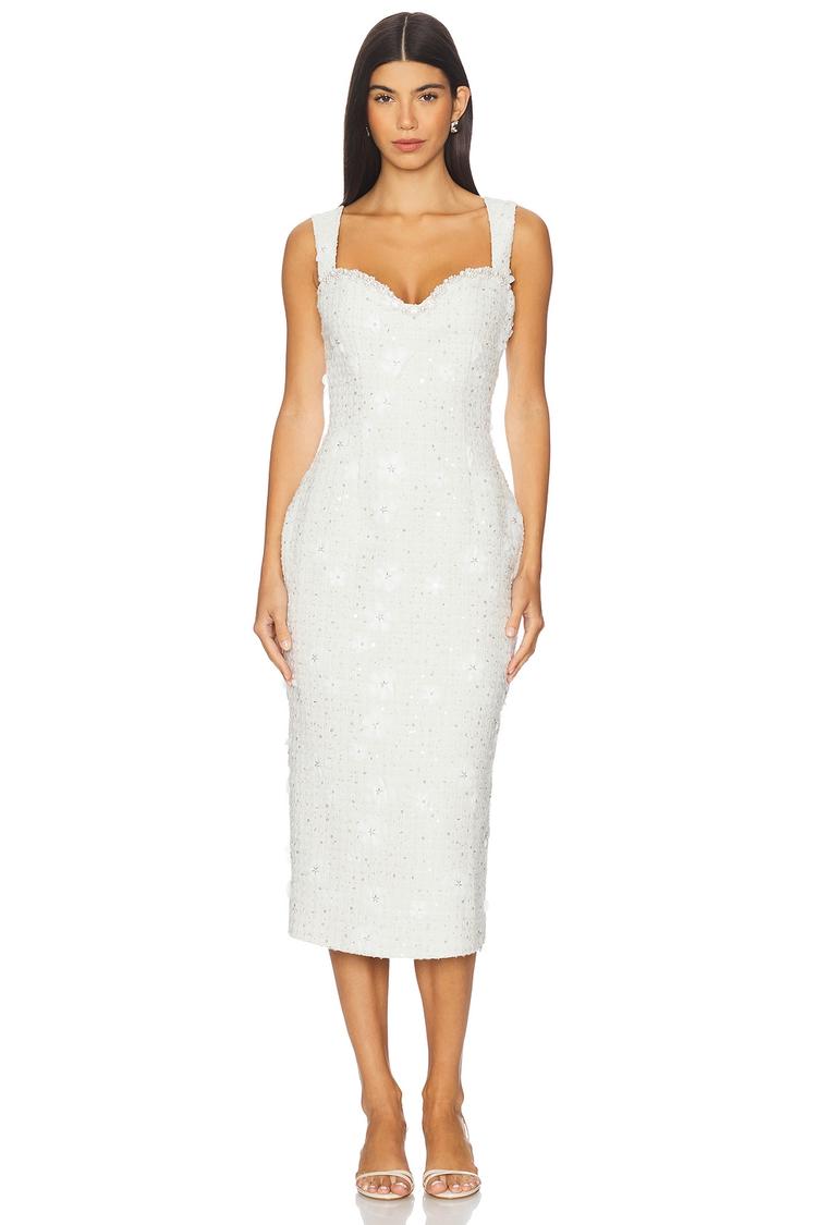 Shimmering sequins and delicate faux pearl trim adorn this elegant sheath midi dress, crafted in a midweight tweed fabric for a sophisticated texture. The fitted silhouette hugs the body, accented by a sweetheart neckline and wide straps for a flattering, sleeveless look. A clean hemline with a back slit adds subtle movement, while an invisible back zipper ensures a seamless finish. Perfect for cocktail parties, date nights, formal events, or elegant evening outings, this dress brings a refined charm and modern grace to any special occasion.