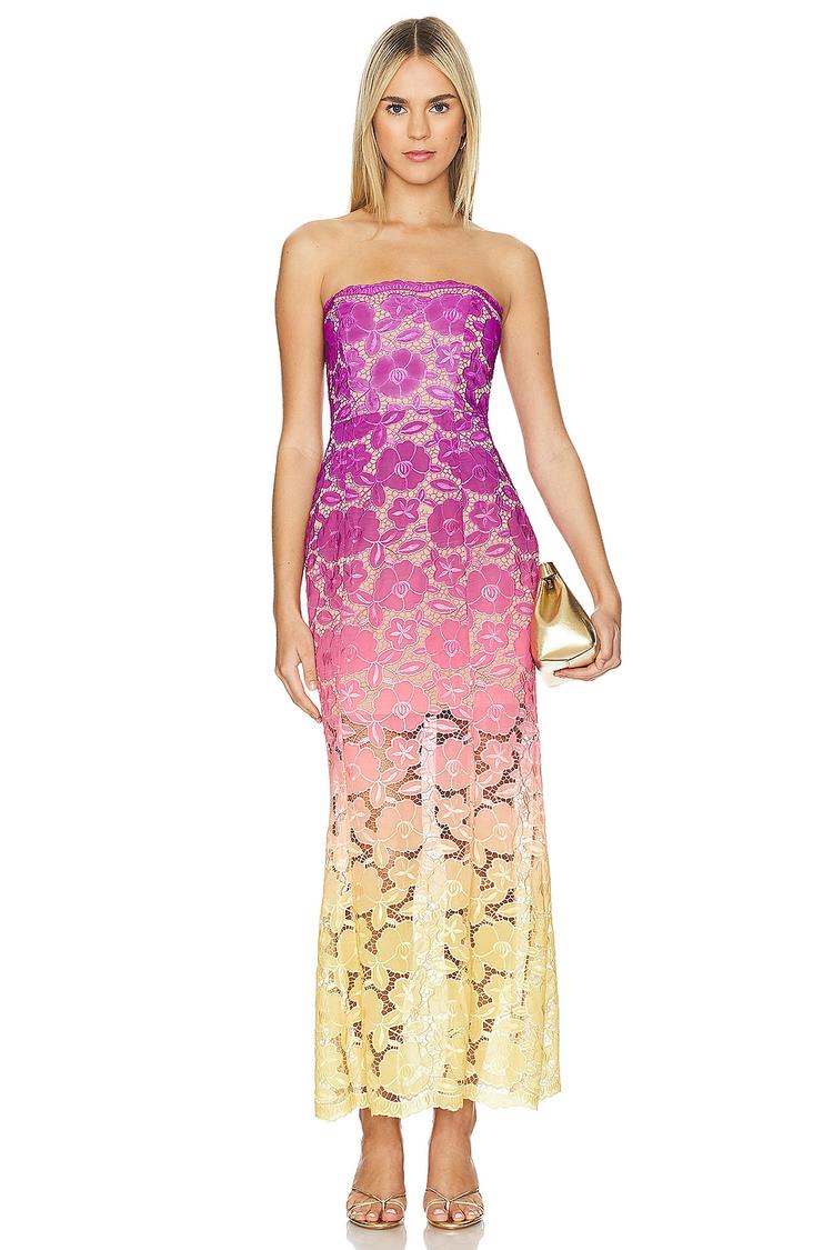 A mesmerizing strapless column dress features a straight neckline and a fitted silhouette that gracefully flows into a maxi-length hem. Crafted from smooth polyester, its floral and animal prints transition beautifully from deep purple through pink to soft yellow, creating a stunning ombre effect. The concealed side zipper and side slit add subtle functionality and flair. Ideal for spring and summer, this elegant piece suits cocktail parties, date nights, and stylish evening outings with its sophisticated charm and vibrant color palette.