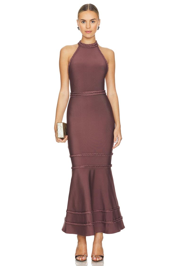 A sleek mermaid silhouette in matte burgundy polyester stretch fabric highlights a fitted shape with a sophisticated high neckline. The open back with a hidden zipper and hook and eye clasp adds an elegant touch. Layered pleats at the hem create subtle movement and refinement. This midi dress is perfect for cocktail parties, formal events, and romantic date nights, offering all-weather versatility with its stretch and comfort. Its clean lines and thoughtful design deliver a polished, sophisticated look for special occasions.