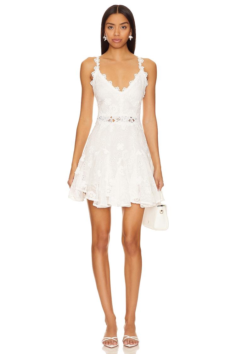 Delicate eyelet embroidery and ruffled details embellish this white mini fit and flare dress crafted from lightweight organza. The V-neckline and sleeveless strap styling highlight a romantic, elegant silhouette with a fitted bodice and open back, perfect for spring and summer occasions. A concealed side zipper ensures a sleek finish, while the fully lined polyester and rayon fabric blend offers comfort and structure. Ideal for brunch, date nights, or cocktail events, this charming dress combines timeless style with feminine grace.