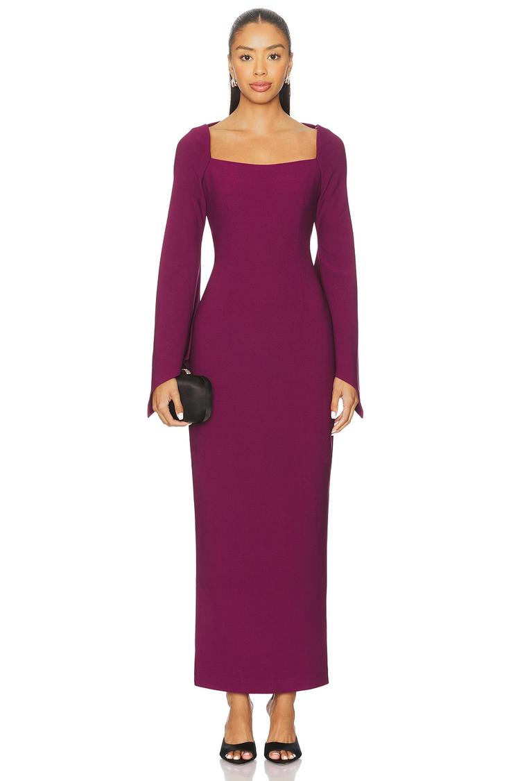 A sleek column silhouette in deep burgundy defines this elegant gown, featuring a flattering square neckline and long sleeves for refined sophistication. Crafted from a smooth blend of polyester and spandex, it offers a comfortable yet fitted look that gracefully skims the body. The concealed back zipper ensures a seamless finish, while the maxi length adds timeless allure. Ideal for formal events, cocktail parties, and romantic date nights, this gown combines classic style with modern elegance for an unforgettable presence.