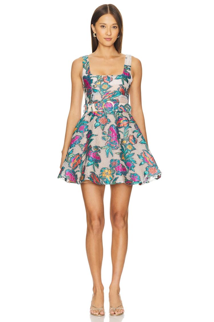A vibrant floral jacquard fabric brings a playful yet elegant touch to this fitted mini dress with a flattering fit and flare silhouette. The sleeveless design and square neckline, complemented by wide straps, create a clean and classic look. Featuring a concealed back zipper and an adjustable belt at the waist, it ensures a perfect fit. Ideal for spring and summer occasions such as brunch, date nights, and cocktail parties, this dress combines comfort with style in polyester and spandex blends for a sleek finish.