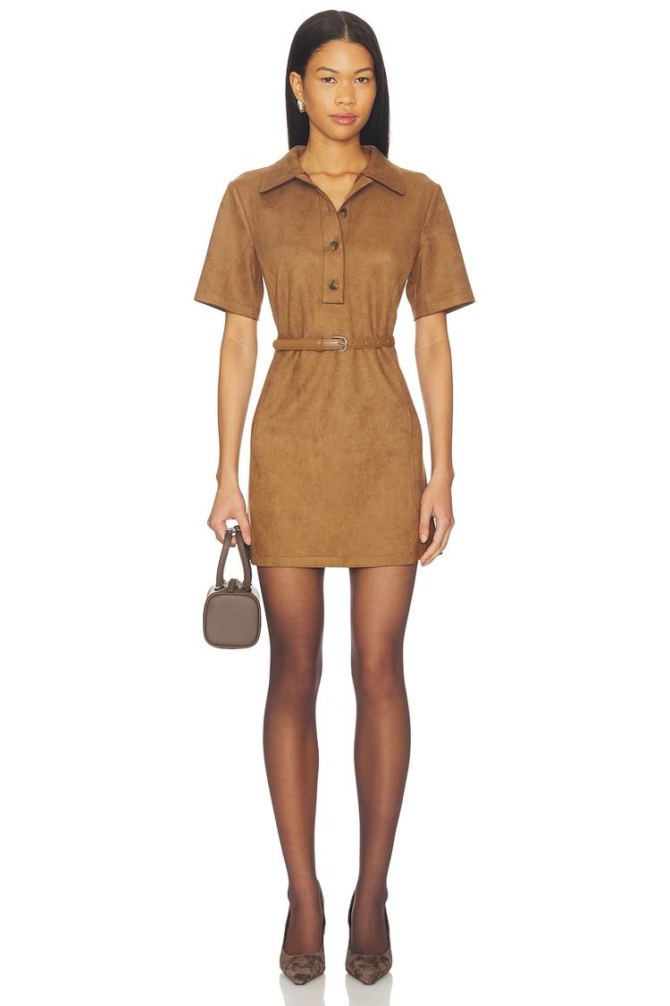 Matte tan vegan suede lends a soft yet structured feel to this mini shift dress, designed with a classic collar and half sleeves for timeless appeal. The front button closure and adjustable belt at the waist create a flattering silhouette, while the clean hemline enhances the minimalist style. Crafted from a polyester-spandex blend, this midweight dress balances comfort and form. Ideal for casual outings, brunch dates, or everyday wear in transitional seasons, it offers versatile, chic simplicity with a subtle edge.