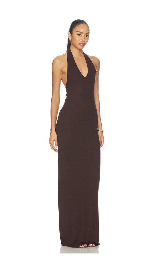 ENZA COSTA SILK RIB U-NECK HALTER FLUID MAXI DRESS IN CHOCOLATE.