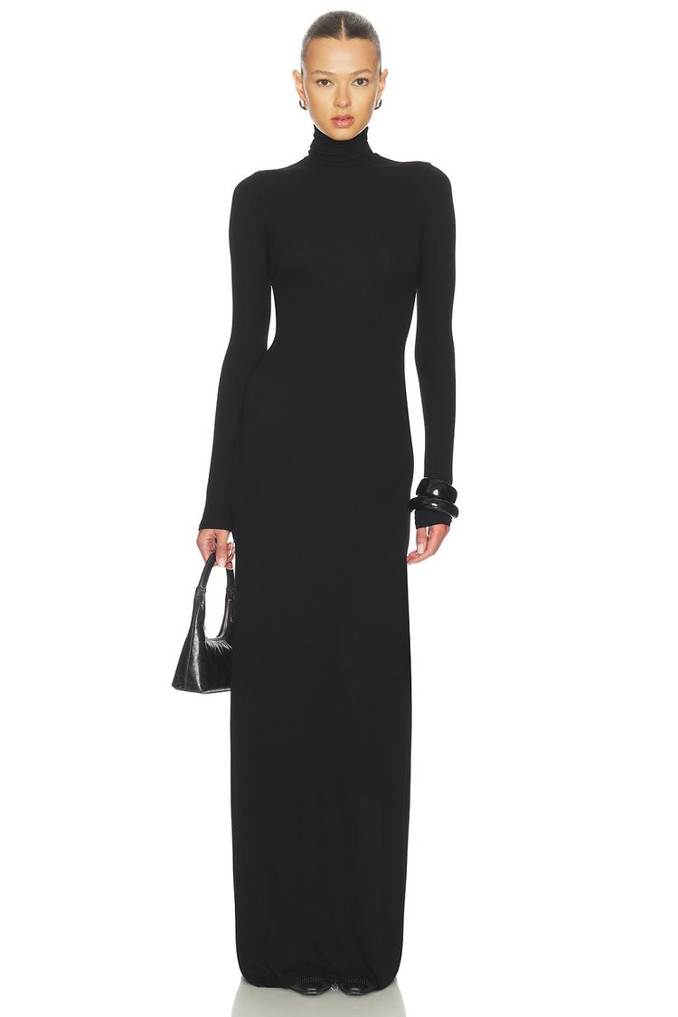 Refined and sleek, this matte black column maxi dress features a close fit and a chic turtle neck, perfect for cooler seasons. Crafted from a luxurious blend of viscose, silk, and lycra jersey fabric, it offers fluid movement and subtle stretch for comfort. The long sleeves and clean hemline enhance its minimalist elegance, making it an ideal choice for cocktail parties, formal events, or sophisticated business casual occasions. Pullover styling ensures effortless wear, while the covered back maintains a classic silhouette that exudes understated sophistication.