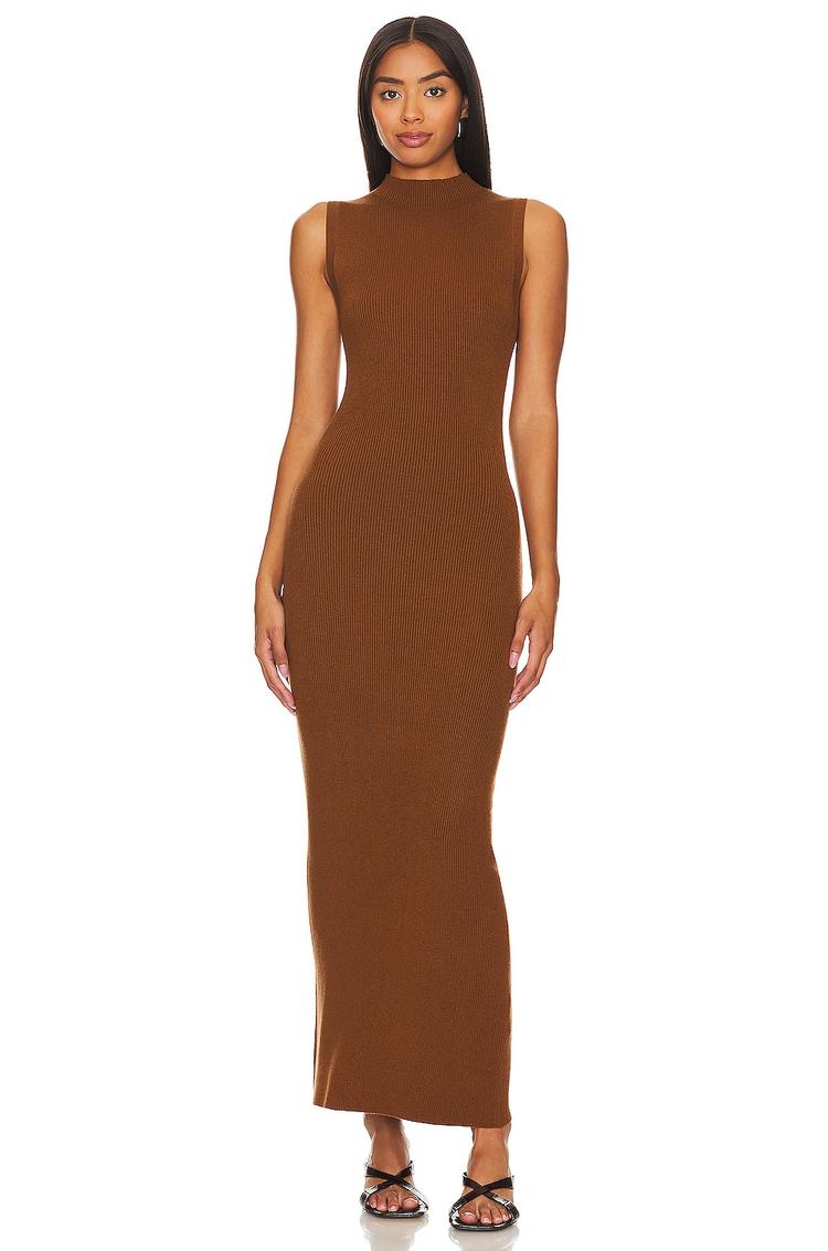 A sleek, fitted silhouette crafted from a midweight ribbed knit fabric combines comfort and sophistication in this matte brown sheath dress. Featuring a mock neck and sleeveless design, it offers a timeless look perfect for autumn and winter evenings. The clean hemline and pull-on styling make it effortlessly elegant for cocktail events, date nights, or night outs. The blend of viscose, silk, nylon, and spandex ensures a luxe feel with subtle stretch, embodying minimalist and sophisticated style.