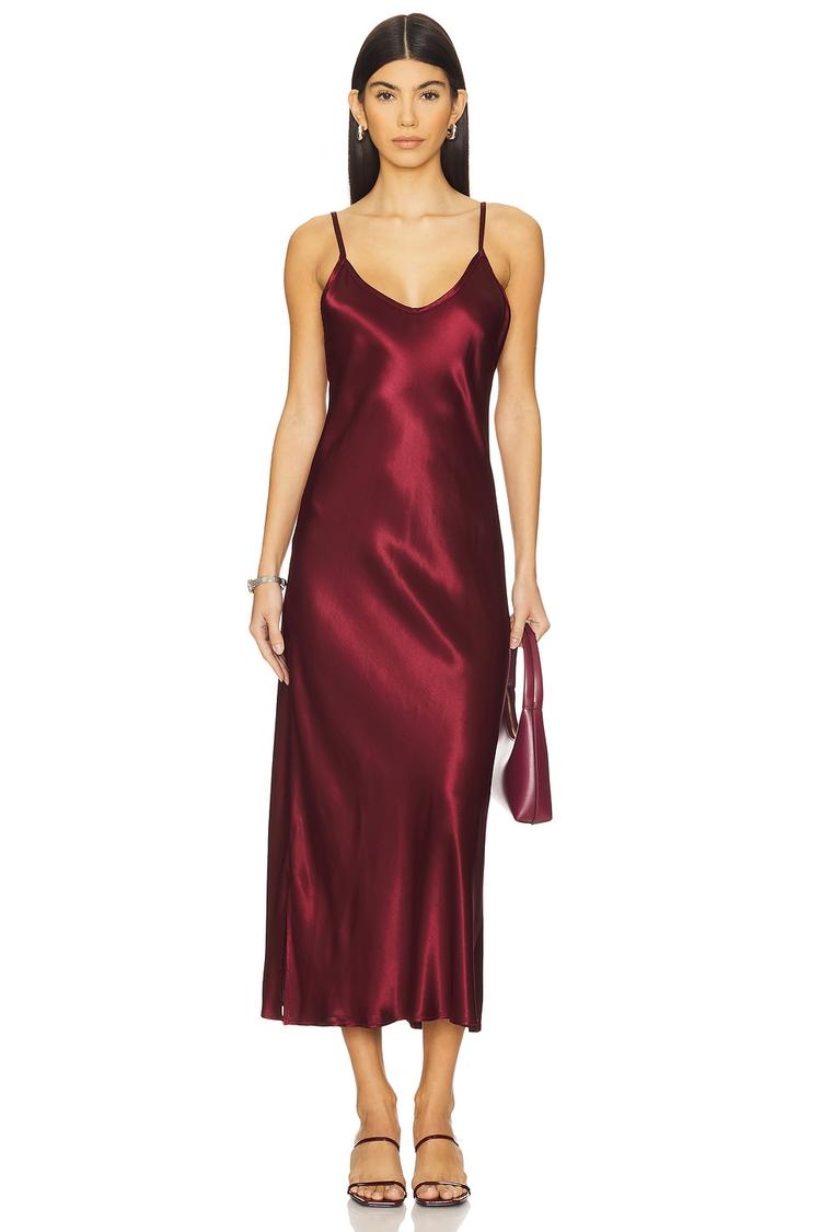 Shimmering satin in a deep burgundy hue defines this bias cut slip dress, delivering a sleek and slim silhouette that gracefully skims the body. The midi length and adjustable spaghetti straps complement the elegant V-neckline, creating a timeless minimalist look. Crafted from midweight rayon satin, this unlined dress offers effortless slip-on styling perfect for cocktail parties, night outs, and romantic date nights. Its clean hemline and simple design make it a versatile piece for sophisticated occasions across seasons.