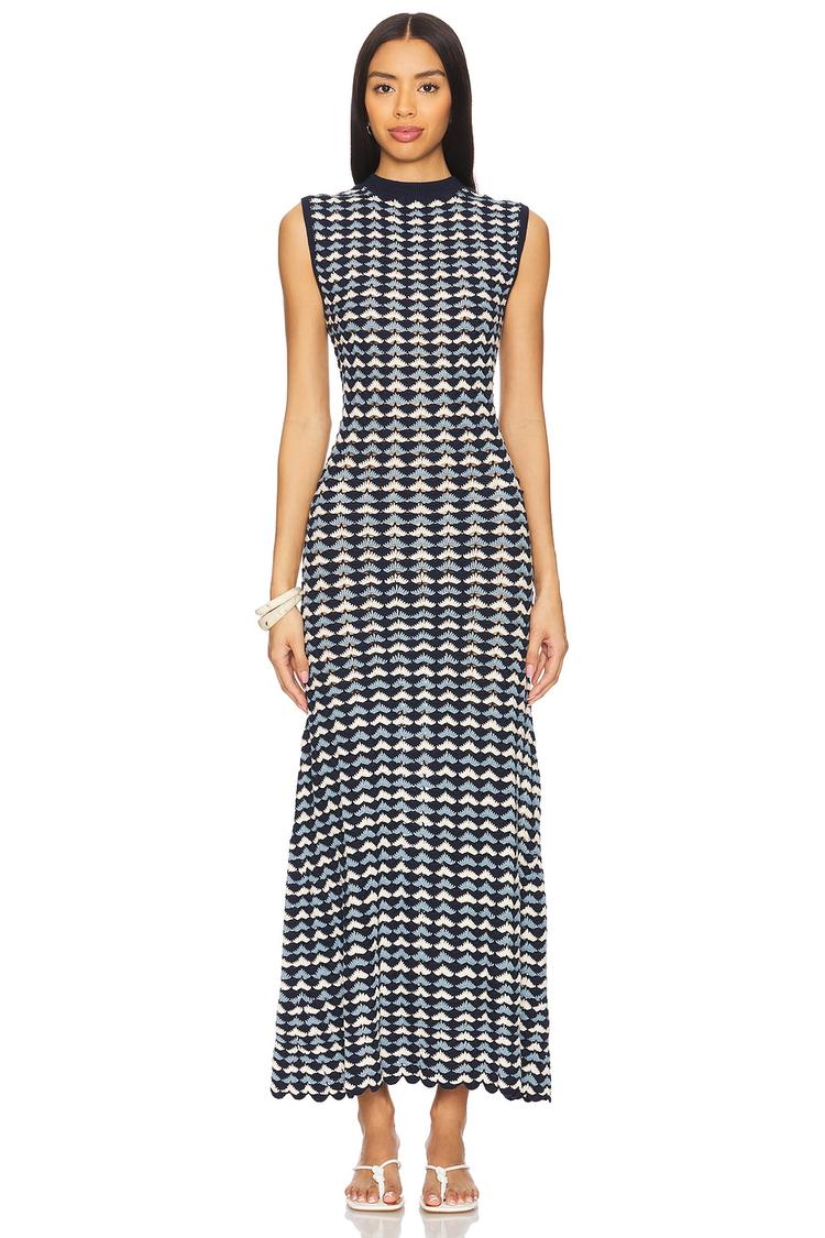 Intricately crafted from midweight cotton crochet knit, this sleeveless maxi dress features a high neckline and a flattering regular fit that flows gracefully to a clean hemline. The all-over geometric pattern in navy and white creates a timeless bohemian vibe, perfect for casual outings, weekend brunches, or vacation days. A subtle back keyhole with button closure adds a delicate detail while maintaining ease of wear. Embrace effortless style and breathable comfort in this versatile maxi, designed for spring and summer seasons.