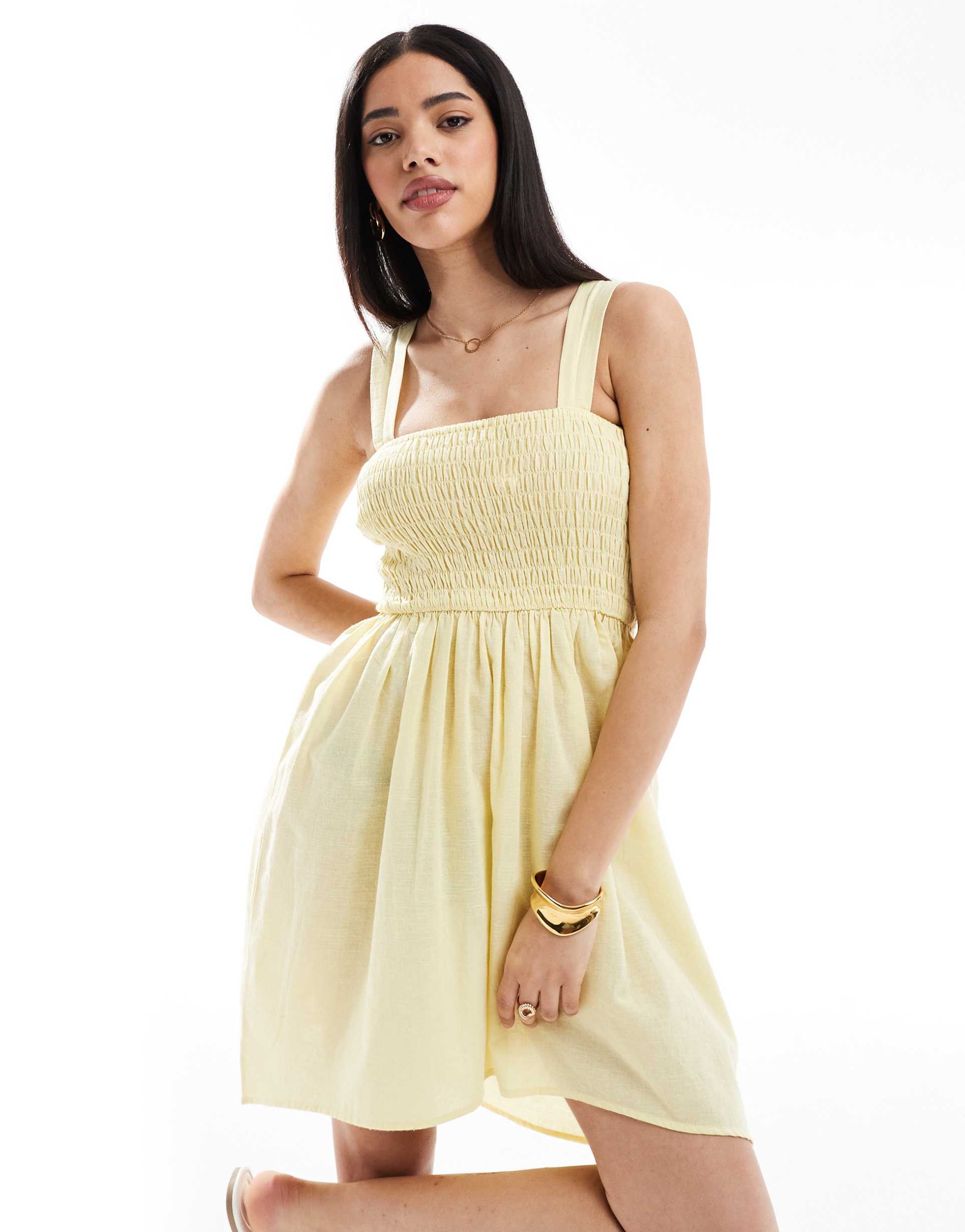 Soft cotton-linen fabric and a regular fit come together in this yellow mini dress featuring a square neckline and wide straps for a comfortable summer look. The shirred bodice adds texture and shape, complemented by a subtle tie detail at the front. Its clean hemline and casual chic A-line silhouette make it perfect for beach days, casual brunches, or vacation strolls. Lightweight and breathable, this dress is a sunny staple for warm-weather occasions.