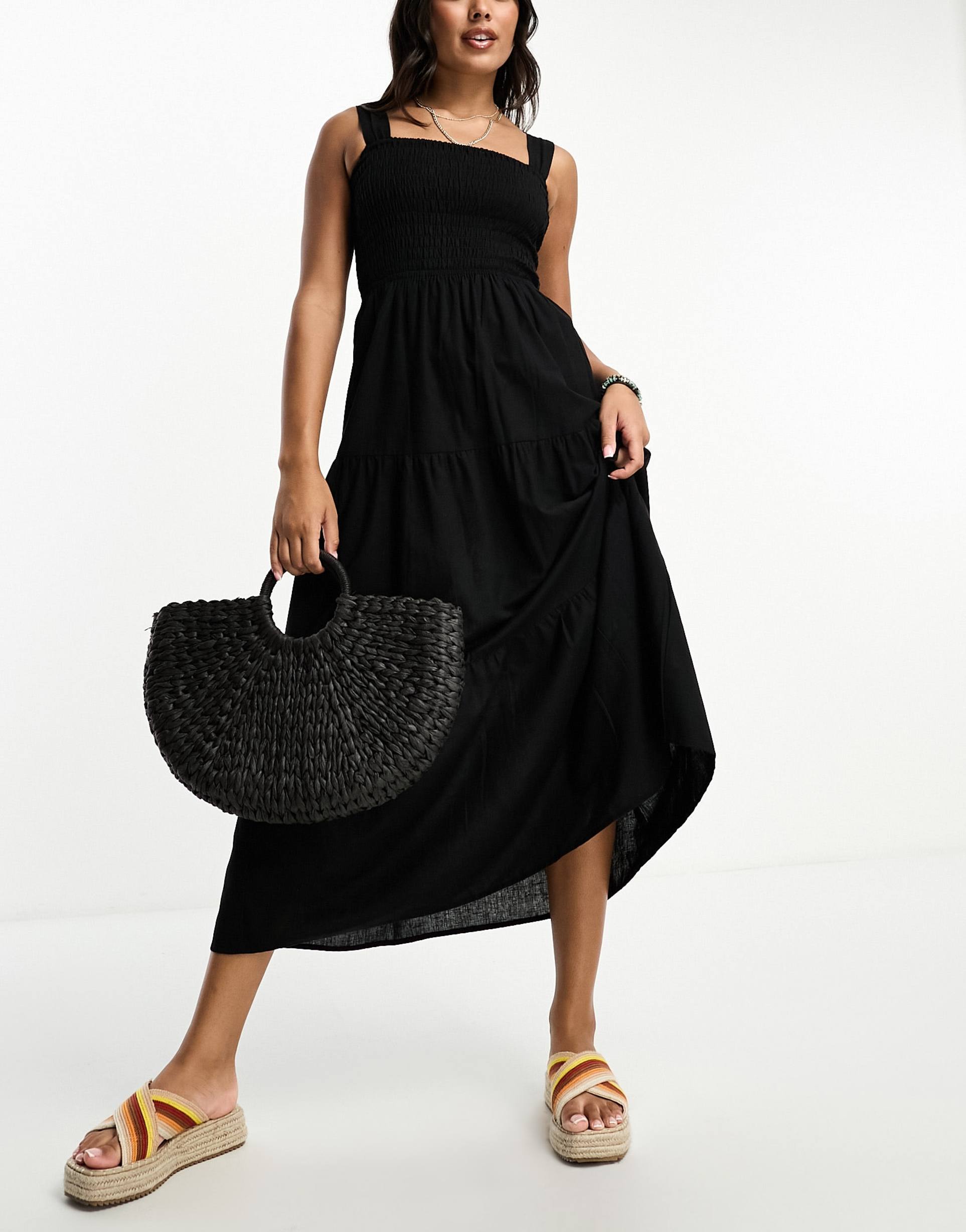 Soft, lightweight cotton in matte black shapes this summer maxi dress with a square neckline and sleeveless design. The regular fit is enhanced by a shirred, stretch bodice that creates subtle texture and comfort. The A-line silhouette flows gracefully to a clean hem, making it a versatile choice for casual outings, beach days, or relaxed brunches. A timeless minimalist style crafted for warm weather with breathable cotton fabric ensures ease and style in equal measure.
