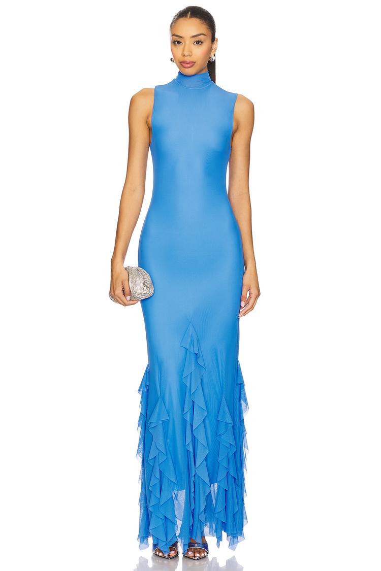 A sleek column silhouette with a fitted cut and striking turtleneck collar defines this matte blue maxi dress. Crafted from midweight mesh fabric with a nylon, elastane, and polyester blend, it offers subtle stretch and comfort. The sleeveless design and concealed back zipper maintain clean lines, while ruffled trim at the hem adds elegant movement. Fully lined for smooth wear, this dress suits formal occasions, cocktail events, and galas where sophisticated style is essential.