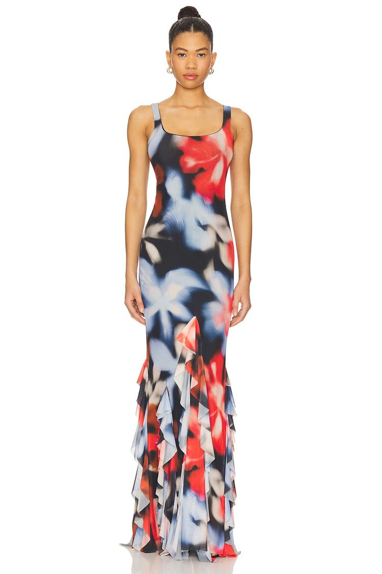 A flowing maxi silhouette in midweight mesh fabric features a striking floral print in dusty blue, rose, and off-white hues against a matte black base. The fitted column shape is enhanced by wide straps and a square neckline, creating an elegant and sophisticated look. Ruffled detailing at the hem adds a feminine touch to this pull-on style dress, fully lined for comfort. Ideal for cocktail parties, formal events, or romantic date nights, this dress brings effortless grace and versatility to your wardrobe.