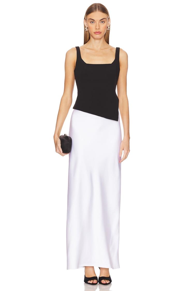 A striking contrast of a matte black crepe bodice paired with a flowing satin white maxi skirt defines this elegant slip dress. The slim fit silhouette, square neckline, and sleeveless wide straps create a minimalist yet sophisticated look perfect for formal evenings, cocktail parties, or wedding guest appearances. The hidden side zipper ensures a seamless finish, while the partial lining adds comfort. Ideal for spring and summer, this dress blends luxurious polyester and elastane fabrics for a smooth, graceful drape.