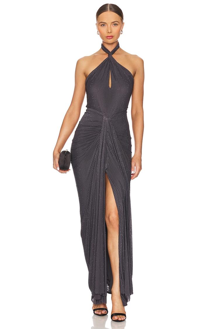 Heavyweight sequin jersey fabric and a figure-hugging column silhouette create a striking presence in this elegant halterneck gown. Featuring a keyhole chest design and artful draping accents, it offers a flattering fitted shape with a maxi length and a daring front slit. The invisible back zipper and hook-and-eye closure ensure a sleek, polished finish. Perfect for cocktail evenings, formal events, or night outs, this matte black gown combines sophisticated style with modern glamour and comfortable stretch fabric for all-weather wear.