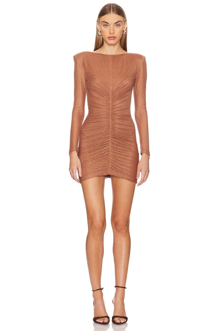 Ruffled detail and padded shoulders accentuate this fitted mini dress crafted from stone-embellished mesh fabric, offering a matte stone hue perfect for evening allure. The long sleeves and round neckline create a sleek silhouette with hidden back zipper closure for a seamless finish. Ideal for cocktail parties, night outs, and romantic date nights, this bodycon dress combines modern elegance with a trendy edge. Its fully lined polyester and spandex blend ensures comfort and a flattering fit across seasons. Step into effortless sophistication with this standout piece designed for confident, stylish occasions.