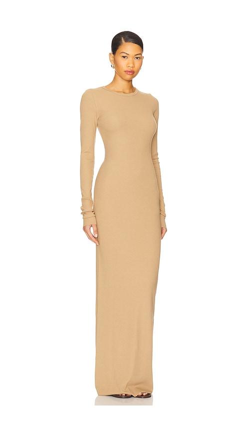 ETERNE LONG SLEEVE CREWNECK MAXI DRESS IN TAUPE.