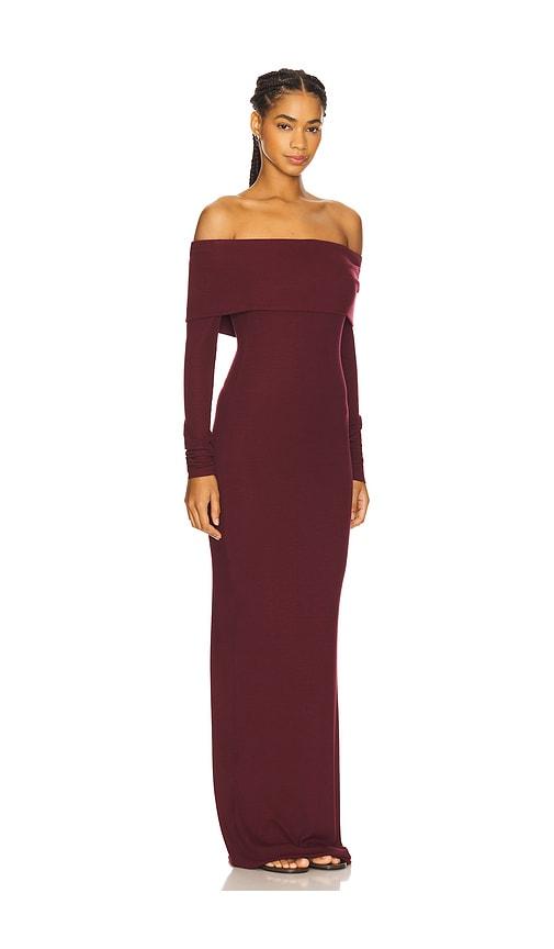 ETERNE LONG SLEEVE OFF-SHOULDER BUTTER RIB MAXI DRESS IN WINE.
